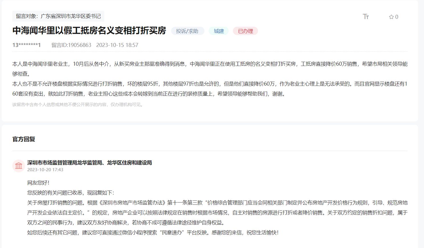 稍早的10月15日,一名自稱深圳市龍華區(qū)中海聞華里老業(yè)主在領導留言板留言稱,該樓盤以假工抵房名義變相打折買房。