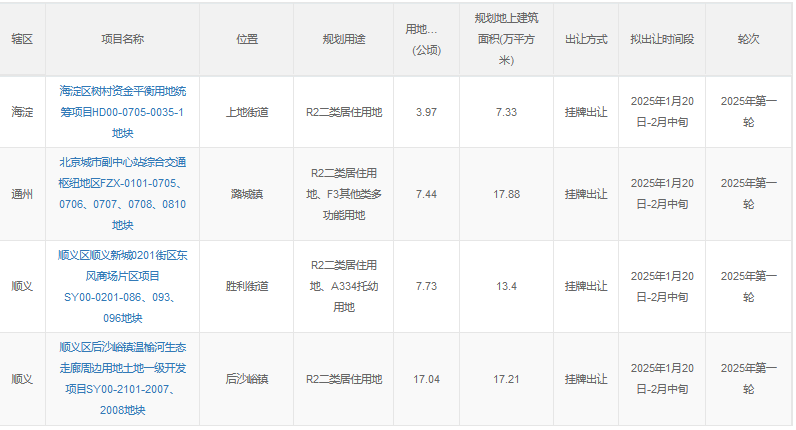 同一天,北京市規(guī)劃和自然資源委員會(huì)網(wǎng)站發(fā)布了2025年度第一輪擬供應(yīng)商品住宅用地清單,共涉及4宗地,土地面積約36.18公頃,建筑規(guī)模約55.82萬平方米,將于2025年2月中旬供應(yīng)。整體來看,本輪推出地塊均位于市場(chǎng)需求突出、基礎(chǔ)設(shè)施和公共服務(wù)配套較好的區(qū)域,共涉及海淀、城市副中心、順義新城和后沙峪4宗地。