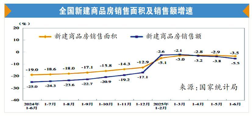 根據(jù)國家統(tǒng)計局發(fā)布的2025年上半年全國房地產(chǎn)市場基本情況,上半年,新建商品房銷售面積45851萬平方米,同比下降3.5%;其中住宅銷售面積下降3.7%。新建商品房銷售額44241億元,下降5.5%;其中住宅銷售額下降5.2%。6月末,商品房待售面積76948萬平方米,比5月末減少479萬平方米。其中,住宅待售面積減少443萬平方米。
