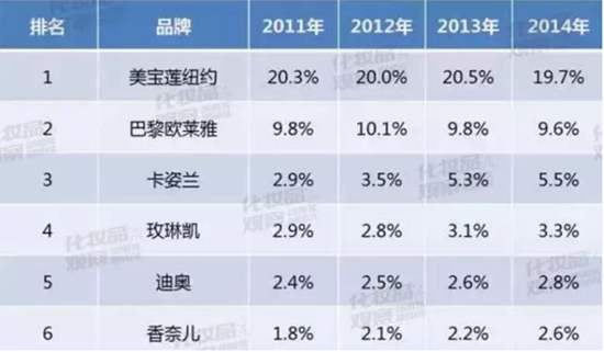2014年,美寶蓮在中國的零售額到達了40億人民幣,而且以遠超其他品牌的市場占有率穩(wěn)居中國彩妝市場第一位的位置。但隨著國內(nèi)本土彩妝的興起及現(xiàn)有彩妝市場的飽和,美寶蓮在經(jīng)歷野蠻生長期后增長速度開始放緩。