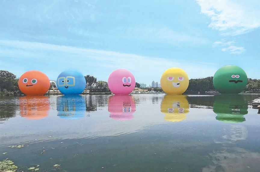 五月天大球在朝陽(yáng)公園水面上。