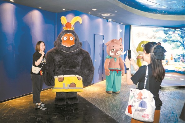 從走出軌交徐家匯站的那一刻起,“浪浪山”主題燈箱便接連映入眼簾,悄然揭開(kāi)這個(gè)奇幻宇宙的序幕;美羅城商場(chǎng)球幕上的“小豬妖”頭像和“這條路走對(duì)了”的標(biāo)語(yǔ),引人駐足眺望;走進(jìn)“大王洞”觀影,挑選三五周邊玩偶、精美文創(chuàng)產(chǎn)品,在360°環(huán)形劇場(chǎng)聽(tīng)一場(chǎng)“浪浪山開(kāi)放麥”,在“豬媽媽茶水站”來(lái)一杯飲料……這趟沉浸式體驗(yàn)豐富而圓滿。