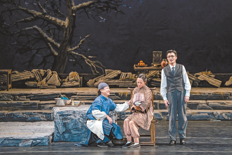 故事中的“煙火氣”則體現(xiàn)在兩處舞臺(tái)設(shè)置上:垂下的紗簾幕自由展現(xiàn)出各種城市風(fēng)貌與相關(guān)故事元素;一棵高大的樹(shù)立于其中,帶來(lái)堅(jiān)硬又孤零的氣息。舞美設(shè)計(jì)李彪說(shuō):“北京題材的戲,我繞不開(kāi)這棵樹(shù),是冥冥之中的感覺(jué)。”在他一直以來(lái)的感受里,老舍先生就如這樣一棵樹(shù),“孤獨(dú)……又有生生不息的感覺(jué),雖然是一棵冬天的沒(méi)有樹(shù)葉的樹(shù),周?chē)h(huán)境也很寒冷,但樹(shù)立在那里,是又孤獨(dú)又溫馨的。”