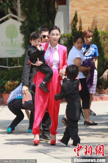 資料圖:張柏芝攜同兩個兒子Lucas(謝振軒)和Quintus(謝振南)。圖片來源:CFP視覺中國