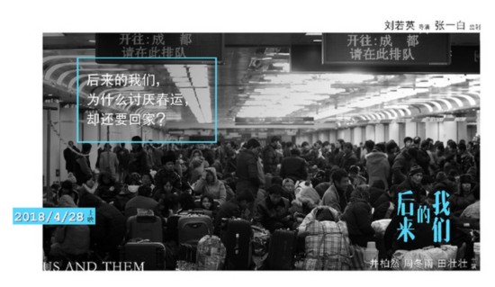 在監(jiān)制張一白的助力下,電影不但真實(shí)的還原春運(yùn)的場(chǎng)景,火車更成為男女主人公的初遇邂逅之地。預(yù)告片以周冬雨扮演的小曉在冰天雪地的回家的路上,一聲〝最恨春節(jié)〞的臺(tái)詞起始,最后落在男主角井柏然飾演的見清撿起她的車票收尾。期間,在黑白的電影畫面里,漂泊的人們步履匆匆,扛著大包小包匆忙的走向站臺(tái),火車上人頭攢動(dòng),直到周冬雨與井柏然的邂逅讓畫面充滿了色彩。勾起了觀眾對(duì)兩位主人公接下來(lái)的人生命運(yùn)和情感經(jīng)歷將如何發(fā)展的好奇心。