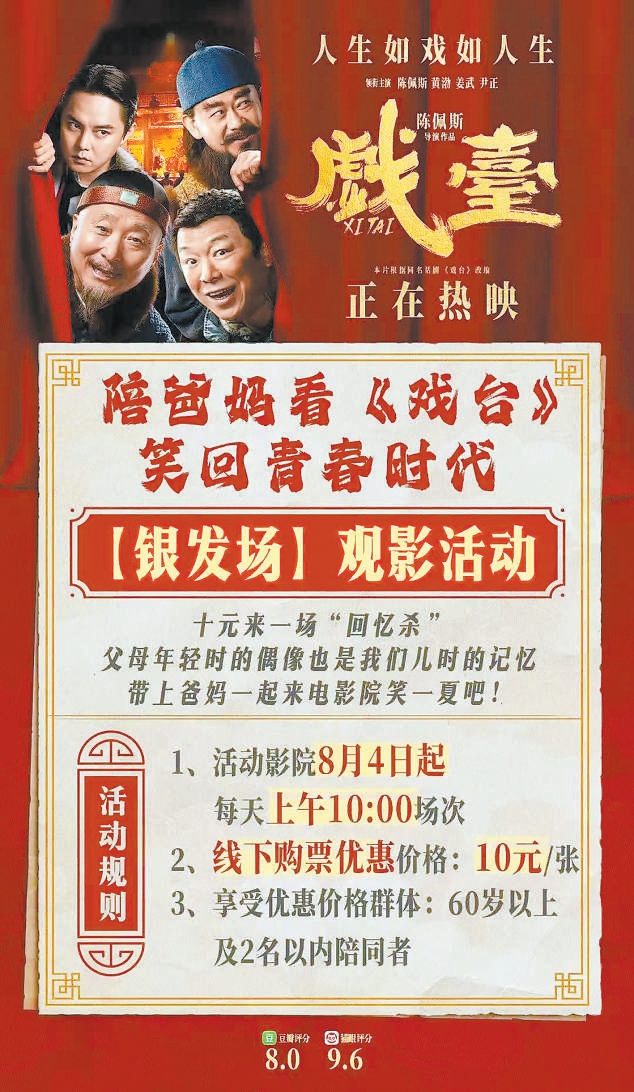 《戲臺》則推出“銀發(fā)場”特惠活動(dòng)?!靶Ч貏e好,線上線下都傳開了,很多觀眾打電話來咨詢?!瘪T賀楠說,北京大約四分之一的影院都有“銀發(fā)場”,他所在影院的“銀發(fā)場”上座率在《戲臺》所有場次中是最高的。 (北京晚報(bào)記者 袁云兒)