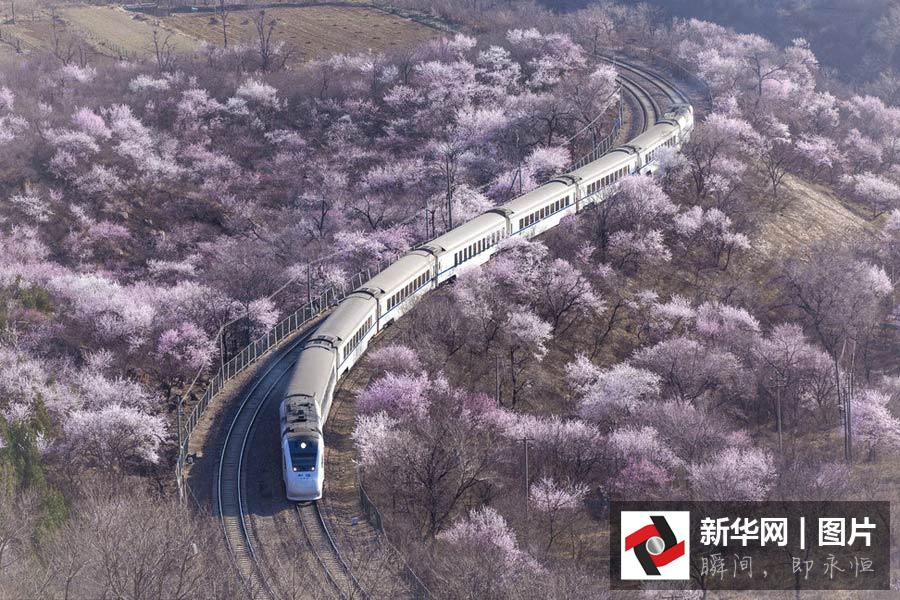 2016年3月23日,中國(guó)北京,又到一年花開(kāi)時(shí),數(shù)京城最美的鐵路景色還看京張鐵路居庸關(guān)。漫山遍野的桃花盛開(kāi),S2雪白的列車(chē)穿行其中,美不勝收。圖片來(lái)源:東方IC