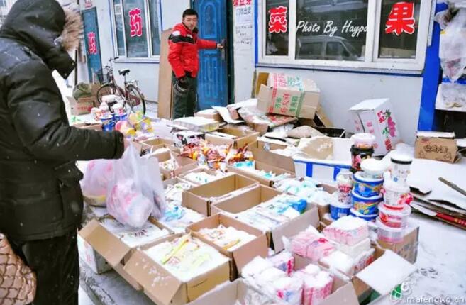 當(dāng)然漠河那么冷,很多東西是不用放在室內(nèi)賣的,比如冰棍、雞鴨魚肉、還有部分水果,天然的冰箱。