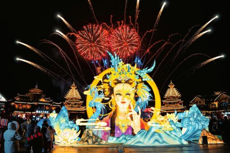 夜幕降臨,園區(qū)瞬間切換至另一番驚艷景象。神州塔下的演藝廣場(chǎng),將以濃烈的“國(guó)風(fēng)+國(guó)潮”風(fēng)格開(kāi)啟夜場(chǎng)演出。威風(fēng)凜凜的舞龍舞獅、婀娜多姿的古典舞蹈等各類(lèi)表演將輪番上陣,令人目不暇接。隨著演出漸入高潮,夢(mèng)幻的燈光秀將伴隨著音樂(lè)節(jié)奏明滅閃爍,在夜色中勾勒出美輪美奐的光影畫(huà)卷。讓人最為期待的煙花秀將壓軸登場(chǎng)。隨著絢麗的煙花轟然沖向夜空,剎那間綻放成五彩斑斕的花火,整個(gè)園區(qū)都仿佛被點(diǎn)亮了,沉浸在一種亦真亦幻的絕美氛圍中。
