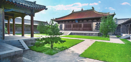 永安寺,原稱(chēng)渾源州永安禪寺及神州大永安禪寺,俗稱(chēng)“大寺”,始建于金,金元之交被火毀后重建,明、清以來(lái)均曾在當(dāng)?shù)毓賳T倡導(dǎo)下續(xù)建與增修。該寺位于渾源古城東北隅,坐西北朝東南,本為以中軸線為主,東西軸各輔以跨院或偏院的五進(jìn)場(chǎng)院空間大型寺廟建筑群,現(xiàn)僅存前院及東西跨院和中院主體建筑群,東西寬52米,南北深78米,占地面積4056平方米。寺內(nèi)現(xiàn)存文物建筑物7座、清代壁畫(huà)305.4平方米、建筑彩畫(huà)2118平方米,古代碑碣2方,石獅一對(duì)。主殿傳法正宗殿為元延祐二年(1315年)原構(gòu),是我國(guó)建筑史上廡殿頂建筑的杰作,殿內(nèi)滿(mǎn)堂水陸畫(huà)、建筑彩畫(huà)及殿頂五彩琉璃均保存完好且異常精美,聞名遐邇。