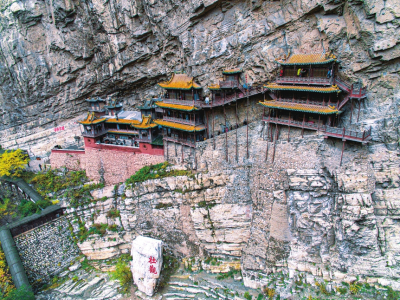 懸空寺位于恒山第二主峰翠屏峰的半崖峭壁間,始建于北魏后期,距今已有1500多年的歷史。整個(gè)建筑上載危巖,下臨深谷,樓閣懸空,結(jié)構(gòu)奇巧,是我國(guó)古建筑中罕見(jiàn)的杰作,堪稱(chēng)“天下一絕”。詩(shī)仙李白游懸空寺后揮毫寫(xiě)下“壯觀”二字,以表其懷。明代旅行家徐霞客在其著作《徐霞客游記》中稱(chēng)贊懸空寺為“天下巨觀”。歷史文化名城保護(hù)委員會(huì)副主任、著名文物專(zhuān)家鄭孝燮視察懸空寺后題詞:“懸空寺玄、絕、奇、險(xiǎn),百來(lái)百看不厭”。