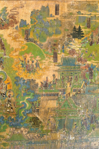但巖山寺金代壁畫(huà)有確切年代,是御前承應(yīng)畫(huà)匠王逵用10年時(shí)間才完成這一煌煌巨制。800多年前,王逵面對(duì)四壁,決然舍棄慣常的連環(huán)畫(huà)形式,大膽?yīng)殑?chuàng),采用滿幅構(gòu)圖形式,以一組繁雜的宮廷建筑為中心,配以各種故事情節(jié)畫(huà)面,然后用山水、樹(shù)石、云嵐連結(jié),細(xì)部真實(shí),透視準(zhǔn)確,遠(yuǎn)看儼然一幅氣勢(shì)磅礴的大型山水畫(huà),近瞧卻又章回分明。壁畫(huà)上就有多處使用瀝粉堆金裝飾,顯現(xiàn)金碧輝煌、富麗非凡的效果。這樣大面積的工筆重彩畫(huà),一絲不茍,找不到起稿與粉本痕跡,而且線條變化多樣,無(wú)一廢筆,令人驚嘆。
