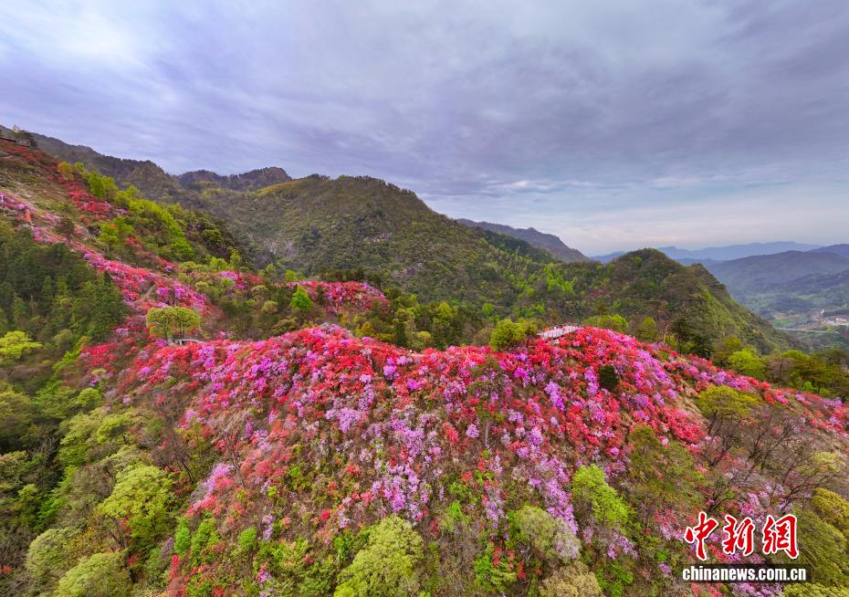 清明假期,位于大別山腹地的安徽省安慶市岳西縣河圖鎮(zhèn)天峽風(fēng)景區(qū)內(nèi),千畝野生高山杜鵑迎來最佳觀賞期。漫山遍野的杜鵑花海沿山脊鋪展,紅、粉、紫、白各色花朵競相綻放,將大別山腹地裝點(diǎn)成一幅絢麗的春日畫卷。圖為4月5日杜鵑花盛開景色。