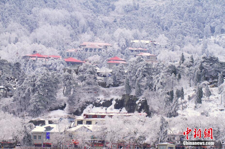 3月10日,受寒潮影響,江西廬山降下2016年入春首場(chǎng)大雪,和霧凇景觀同現(xiàn)。紅色的廬山老別墅房頂,在銀裝素裹的山中格外顯眼。一眼望去,分外妖嬈的廬山猶如仙境畫卷。圖為一眼望去,銀裝素裹分外妖嬈的廬山猶如仙境畫卷。 吳健 攝