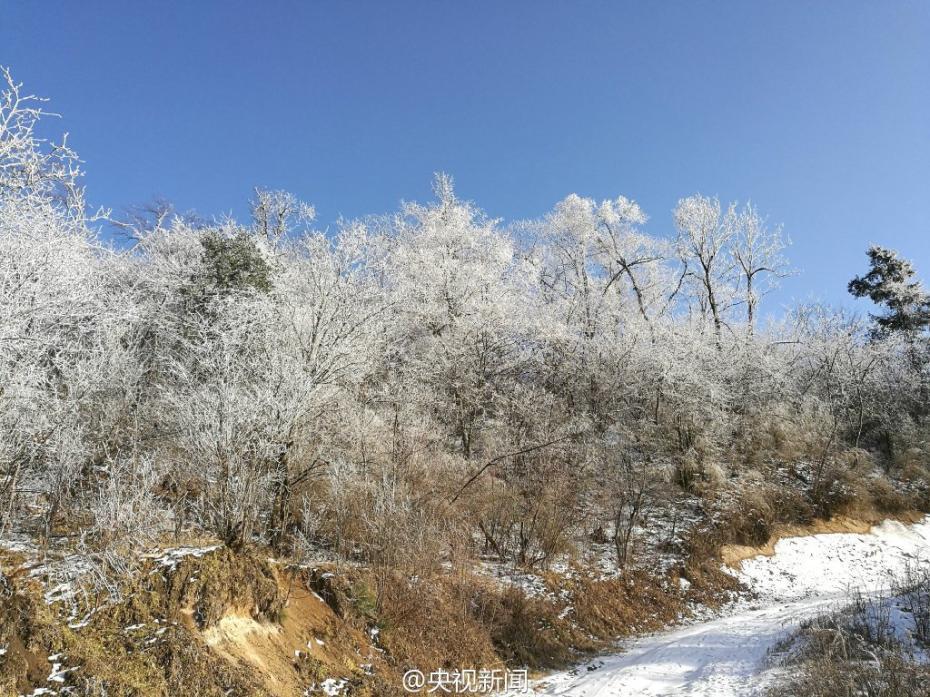 受較強(qiáng)冷空氣影響,秦嶺腹地涼風(fēng)埡山頂,出現(xiàn)大面積霧凇景觀。玉樹瓊枝,晶瑩剔透,讓涼風(fēng)埡山頂變得像童話世界一般,美不勝收。 央視記者王志杰 圖片來源:央視新聞微博