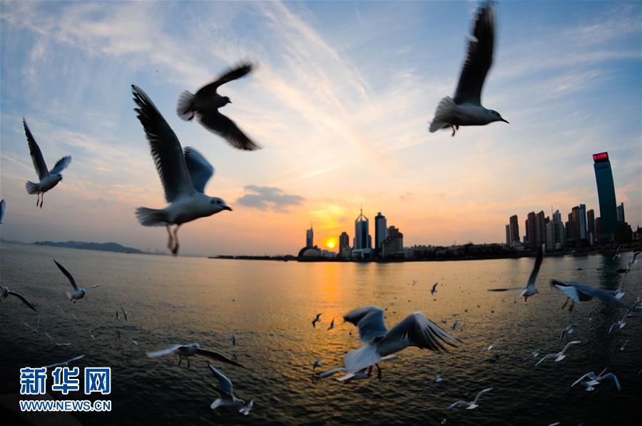 1月10日,水鳥在青島棧橋景區(qū)一帶飛翔。當(dāng)日,山東省青島市天氣晴好,黃昏時分沿海一帶景色迷人。 新華社發(fā)(王海濱 攝)