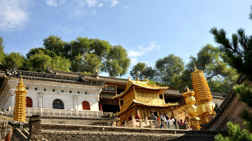 顯通寺的大雄寶殿為舉行佛事活動主要場所,是顯通寺的第三重大殿,殿內(nèi)供著三尊佛像:中是釋迦牟尼佛,西是阿彌陀佛,東是藥師佛;兩旁有十八羅漢像背后有觀音、文殊、普賢三尊菩薩像。觀音殿殿內(nèi),中間供著觀音菩薩像,左右供著文殊和普賢菩薩像。大文殊殿,是顯通寺的第二重大殿。大文殊殿內(nèi),供著七尊文殊菩薩像:正中的為大智文殊;前面的五位,從左至右,依次為西臺獅子文殊,南臺智慧文殊,中臺孺者文殊,北臺無垢文殊,東臺聰明文殊;大智文殊后面是甘露文殊。文殊像前有護(hù)法神韋馱像,兩側(cè)有十八羅漢像。