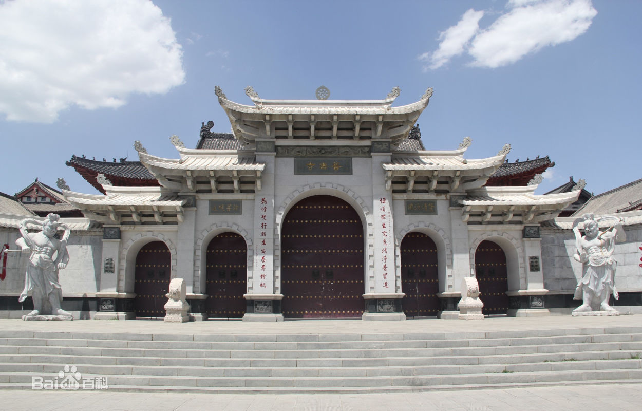 新建的普壽寺坐北面南,占地面積一萬(wàn)九千九百八十八平方米。寺內(nèi)分為東西兩院,東院偌大,前面為非常秀麗的漢白玉牌樓,下層為青磚砌筑,上層為木構(gòu)建筑,單檐五脊頂,四出廊。山門(mén)正面額上嵌一書(shū)有「普壽寺」三字的石匾。西院一進(jìn)四個(gè)小四合院,第一為天王殿院,正面為天王殿,三開(kāi)間,單檐歇山頂。殿內(nèi)正中置木龕,供石刻彌勒佛,背面供彩塑韋馱將軍,兩山間彩塑四大天王。天王殿兩側(cè)為鐘鼓二樓。東西樓二十四間,東配樓為客堂,墻上掛著名人字畫(huà),其中有原中國(guó)佛教協(xié)會(huì)會(huì)長(zhǎng)趙樸初書(shū)寫(xiě)的一副對(duì)聯(lián)「恒順眾生究竟清涼普賢道,勤修梵行愿生安養(yǎng)壽僧祗」。