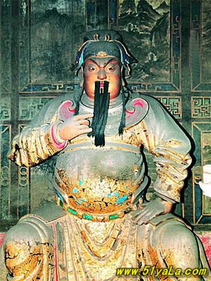 前行有午門.是一座面闊五間,單檐廡殿頂、石雕回廊的廳式建筑。周圍有石欄桿,欄板正反兩面浮雕各類圖案、人物144幅,洋洋大觀,頗有童趣。廳內(nèi)南有周倉、廖化畫像,軒昂威武。北面左右兩側(cè),彩繪著關(guān)羽戎馬一生的主要經(jīng)歷,起于桃園三結(jié)義,止于水淹七軍,只是沒有走麥城這個情節(jié),在全國關(guān)廟壁畫中都按此進(jìn)行,據(jù)說這是因忌諱關(guān)羽自高自大而被殺,終于造成蜀國的覆滅而隱去的。穿過午門,經(jīng)“山海鐘靈”坊、御書樓,便是關(guān)帝廟主體建筑崇寧殿。