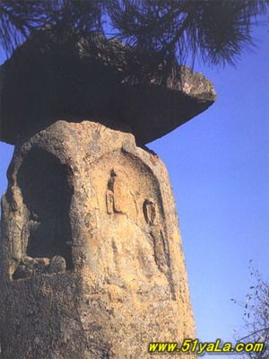 主峰極頂列為首區(qū),有石塔兩座,佛龕一區(qū),龕為三塊巨石疊成,下為臥羊,中為佛龕,上為瓦隴式屋頂,龕內(nèi)內(nèi)置一佛二菩薩,佛像結(jié)跏而坐,面型衣飾皆屬北魏風(fēng)格。