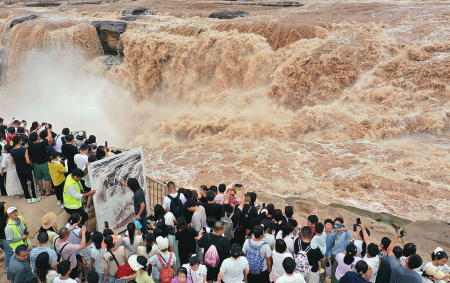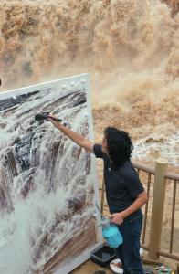 8月10日,一名畫(huà)家在吉縣黃河壺口瀑布景區(qū)現(xiàn)場(chǎng)創(chuàng)作(左圖)。連日來(lái),吉縣黃河壺口瀑布水量持續(xù)增大,形成壯美瀑布群景觀,奔騰咆哮的雄姿吸引了眾多書(shū)畫(huà)愛(ài)好者前來(lái)創(chuàng)作。