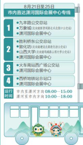 太原市將在山西文博會(huì)期間開通5條免費(fèi)公交接駁專線。其中,4條市內(nèi)直達(dá)瀟河國(guó)際會(huì)展中心的專線,分別從九豐路公交總站—萬象城(北向南新晉祠路長(zhǎng)興北街口公交站)—瀟河國(guó)際會(huì)展中心;勝利橋東公交總站—敦化坊(北向南建設(shè)北路敦化坊公交站)—山西大學(xué)(北向南塢城路山西大學(xué)公交站)—瀟河國(guó)際會(huì)展中心;火車南站西廣場(chǎng)公交站—瀟河國(guó)際會(huì)展中心;西橋地鐵站B站口—瀟河國(guó)際會(huì)展中心。運(yùn)行時(shí)間為市內(nèi)至瀟河方向8:00—15:00,瀟河至市內(nèi)方向10:00—18:00。此外,為便于駕車自行前往的市民出行,還開通了1條社會(huì)停車場(chǎng)至山西瀟河國(guó)際會(huì)展中心的免費(fèi)接駁線路。該線路從先行路瀟河大街口經(jīng)先行路至?xí)怪行耐颠\(yùn)行,在智慧南街口、先行路樂商街口停靠,運(yùn)行時(shí)間為9:00—18:00。