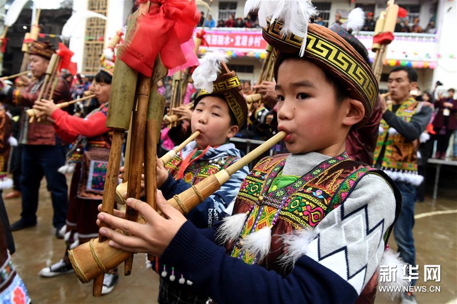 2月7日,廣西融水苗族自治縣安太鄉(xiāng)苗族群眾開展傳統(tǒng)的“打同年”民俗活動。當?shù)財?shù)百名苗族同胞與游客們歡聚一堂,一起開展對歌、蘆笙踩堂、文藝晚會等活動,歡慶新春佳節(jié)。 “打同年”是融水苗族村寨的一種民俗,即友好村寨之間的拜年聯(lián)歡活動。新華社記者 李斌 攝