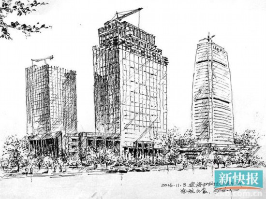 “以前工作日需要上班,我就利用周末在街巷間走動,看到地標(biāo)建筑就開始畫。遇到正在施工的高樓,我就計(jì)算著日子,到高樓即將封頂?shù)臅r(shí)候,我就帶上紙筆到施工現(xiàn)場畫畫?!眳橇⒅薪榻B。