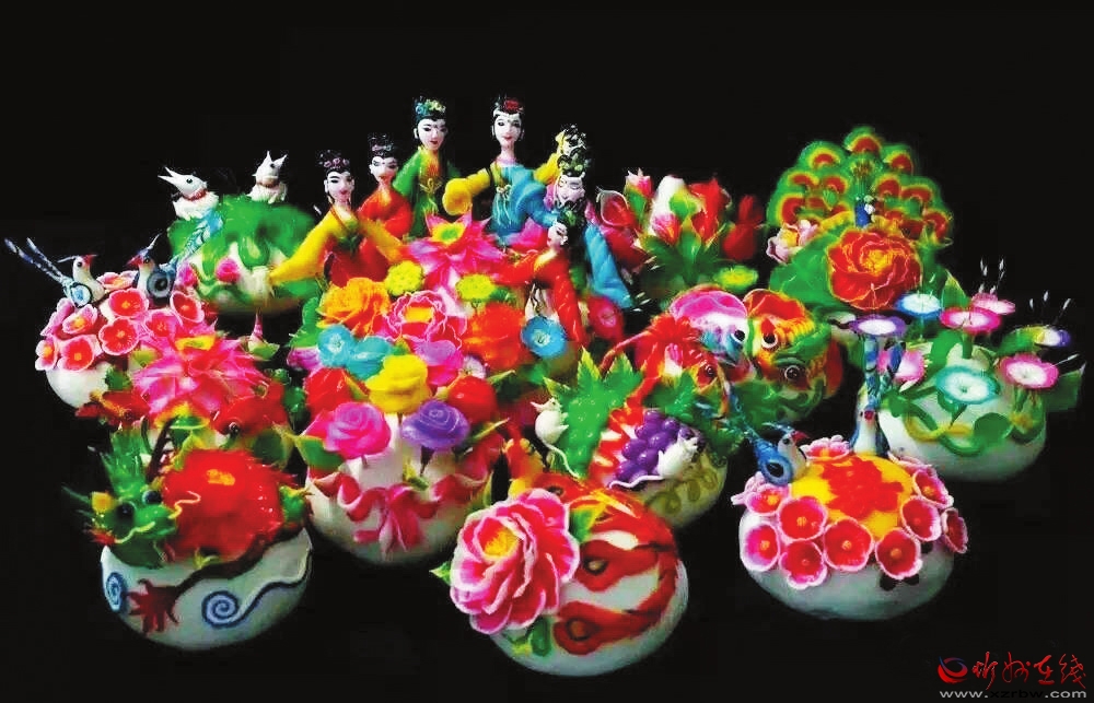 面塑是忻州民間文化最具生命力的工藝品之一,其制作過程十分復雜,包括和面、蒸面、調色、塑型等環(huán)節(jié)。制作時講究巧、潤、透、精,需要用刀、剪、板等工具,融實物、雕塑、繪畫、建筑、民間傳說和神話故事等于一體,通過虛實結合的藝術方式,制作出豐富多彩、栩栩如生的造型,給人以賞心悅目的藝術文化享受。