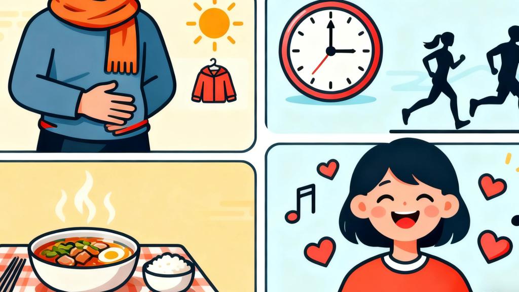 腹部保暖、三餐定時(shí)、規(guī)律作息、情緒管理是護(hù)胃“四大法寶”。AI繪圖??秋冬季如何打好“胃腸保護(hù)戰(zhàn)”?專家認(rèn)為,首先是做好腹部保暖,及時(shí)增添衣物,尤其要避免腹部暴露在冷空氣中,不要長(zhǎng)時(shí)間處于寒冷環(huán)境。其次,飲食要以溫?zé)嵋紫癁橹?,盡量不吃生冷食物,三餐定時(shí)定量,減少腸道負(fù)擔(dān)。第三,規(guī)律作息,避免熬夜,結(jié)合適當(dāng)體育鍛煉促進(jìn)血液循環(huán),增強(qiáng)胃腸蠕動(dòng),提高身體的耐寒能力和免疫力,以此增強(qiáng)胃腸抵抗力。最后,焦慮和抑郁是胃腸疾病的“催化劑”,要學(xué)會(huì)釋放壓力,保持心情愉悅,不讓壞情緒“傷”胃。