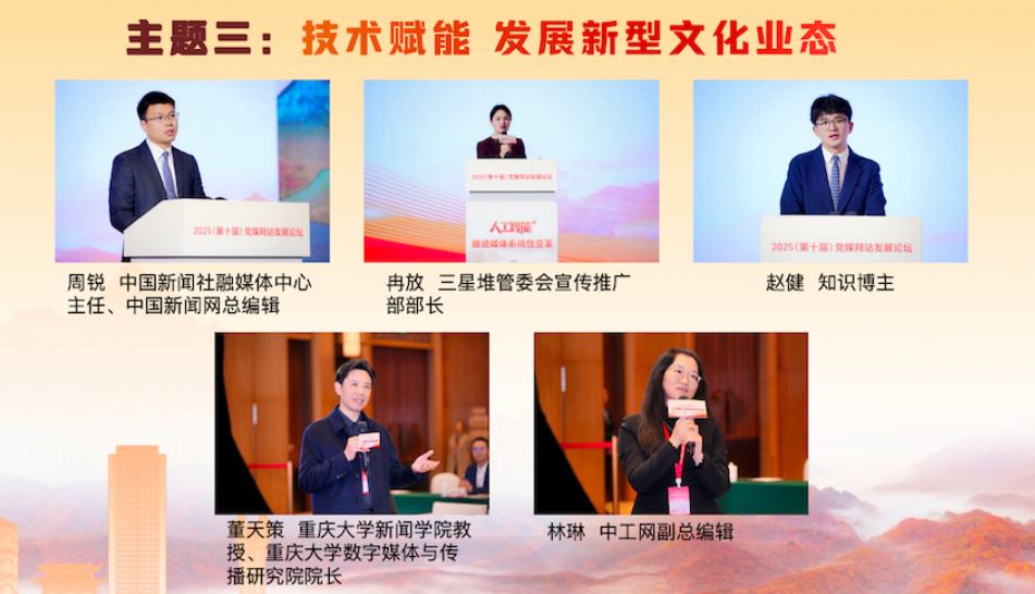 在“技術(shù)賦能 發(fā)展新型文化業(yè)態(tài)”主題研討環(huán)節(jié),中國新聞社融媒體中心主任、中國新聞網(wǎng)總編輯周銳,三星堆管委會宣傳推廣部部長冉放,知識博主趙健,分別就技術(shù)賦能中華文化“破圈”出海、三星堆文化傳播數(shù)智實(shí)踐、短視頻文化傳播等方面的經(jīng)驗(yàn)成果進(jìn)行了精彩展示。重慶大學(xué)新聞學(xué)院教授、重慶大學(xué)數(shù)字媒體與傳播研究院院長董天策,中工網(wǎng)副總編輯林琳作為互動嘉賓進(jìn)行了點(diǎn)評,期待主流媒體發(fā)揮傳播實(shí)踐智慧,在內(nèi)容、技術(shù)和社會責(zé)任之間找到平衡,鑄造中華文化新輝煌。
