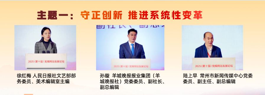 在“守正創(chuàng)新 推進(jìn)系統(tǒng)性變革”主題研討環(huán)節(jié),人民日報(bào)社文藝部部務(wù)委員、美術(shù)編輯室主編徐紅梅,羊城晚報(bào)報(bào)業(yè)集團(tuán)(羊城晚報(bào)社)黨委委員、副社長、副總編輯孫璇,常州市新聞傳媒中心黨委委員、副主任、副總編輯陸上早分別作主旨發(fā)言,介紹了各自領(lǐng)域推進(jìn)系統(tǒng)性變革、發(fā)展新時(shí)代中國特色社會主義文化的實(shí)踐與探索。徐紅梅表示,“每日讀畫”采取“AI+美術(shù)”“微視頻+夜讀”的形式,堅(jiān)持“讀準(zhǔn)、讀細(xì)、讀新、讀美”,讓AI成為深入畫境、開啟古今對話的共創(chuàng)者,以動態(tài)轉(zhuǎn)譯、意境擴(kuò)展、流程再造、視聽融合開發(fā)美術(shù)融媒的敘事潛能,深入挖掘中華文明賡續(xù)傳承的基因密碼,成為探索主流媒體系統(tǒng)性變革的微觀樣本。孫璇表示,羊城晚報(bào)全面啟動系統(tǒng)性變革,以做強(qiáng)媒體、文化、數(shù)據(jù)、產(chǎn)業(yè)四個(gè)戰(zhàn)略板塊為重點(diǎn),把“技術(shù)賦能”嵌入系統(tǒng)性變革各關(guān)鍵板塊,積極增強(qiáng)文化傳播、促進(jìn)文化交流和繁榮文化生產(chǎn)。陸上早表示,常州借“蘇超”東風(fēng),走出城市轉(zhuǎn)型與能級躍升之路。改革的推進(jìn)需聚焦六大方向:組織體系化,內(nèi)容精品化,傳播移動化,技術(shù)現(xiàn)代化,分配績效化,干部年輕化。