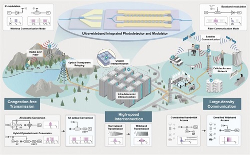 為此,北京大學(xué)聯(lián)合鵬城實(shí)驗(yàn)室、上??萍即髮W(xué)、國家信息光電子創(chuàng)新中心等研發(fā)團(tuán)隊(duì),創(chuàng)出“光纖—無線一體化融合通信”概念,并采用集成光學(xué)方案,成功研制出250GHz(千兆赫茲)以上超寬帶集成光子器件。在此基礎(chǔ)上開發(fā)出的新系統(tǒng)實(shí)現(xiàn)了光纖通信單通道512Gbps(千兆比特每秒)信號(hào)傳輸、無線通信單通道400Gbps信號(hào)傳輸。