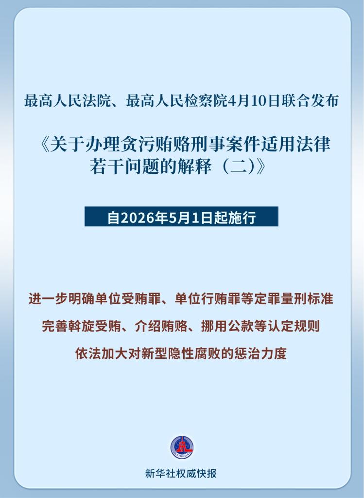 最高人民法院、最高人民檢察院4月10日聯(lián)合發(fā)布《關(guān)于辦理貪污賄賂刑事案件適用法律若干問(wèn)題的解釋?zhuān)ǘ?,?026年5月1日起施行。