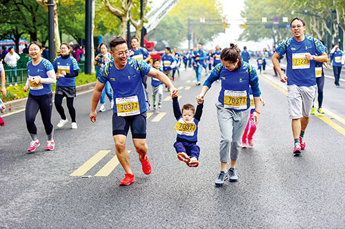 11月4日,多地舉辦馬拉松比賽,眾多長跑愛好者參與其中,享受運(yùn)動(dòng)帶來的快樂。圖為家長帶著孩子參加浙江杭州舉行的馬拉松比賽。據(jù)新華社 徐暉 攝