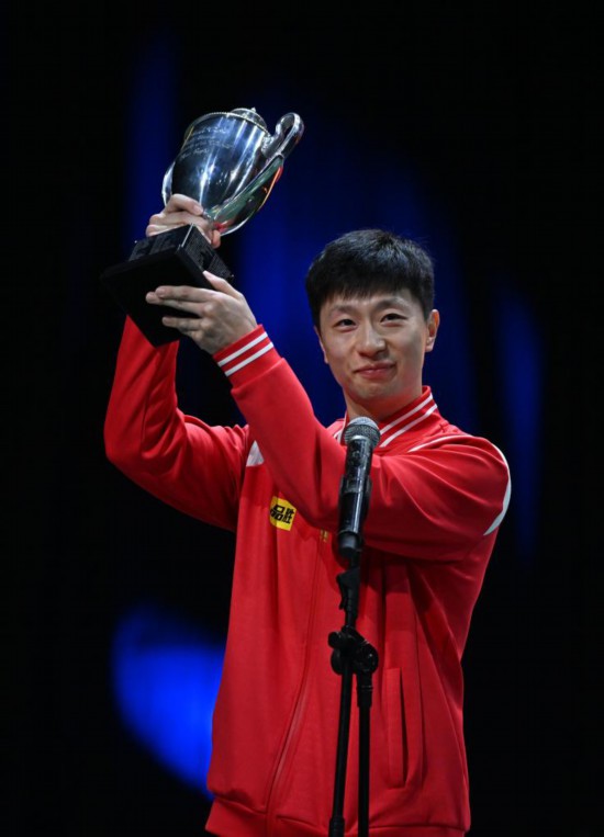 當日兩場單打決賽之間,國際乒聯(lián)為2015年至2019年完成世乒賽男單三連冠的馬龍頒發(fā)了復刻圣·勃萊德杯。(蘇斌、謝江)