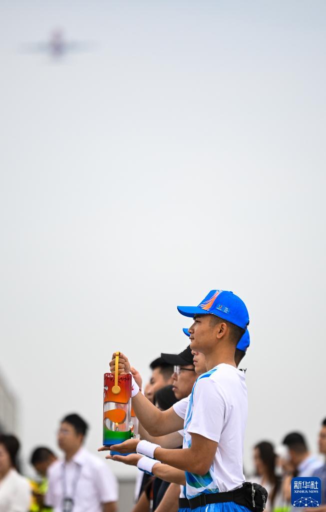 6月8日,在成都天府國(guó)際機(jī)場(chǎng),護(hù)衛(wèi)隊(duì)隊(duì)員手持成都大運(yùn)會(huì)火種燈。新華社記者 王曦 攝