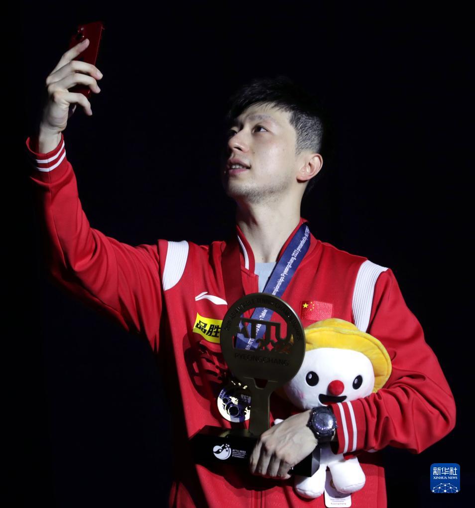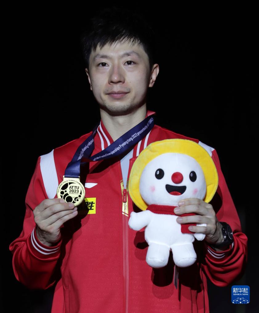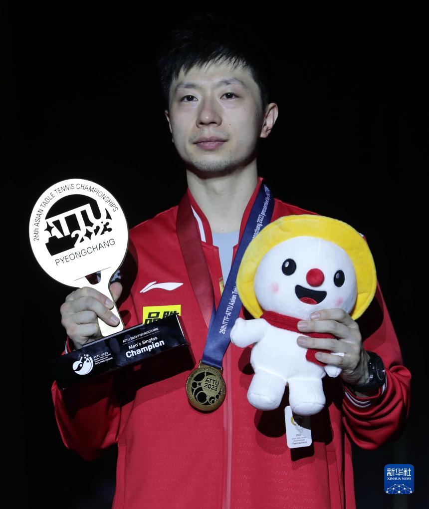 9月10日,馬龍?jiān)陬C獎(jiǎng)儀式上。新華社發(fā)(李相浩攝) 當(dāng)日,2023年乒乓球亞錦賽男單決賽在韓國平昌舉行。中國隊(duì)選手馬龍以3比2戰(zhàn)勝隊(duì)友樊振東,奪得冠軍。