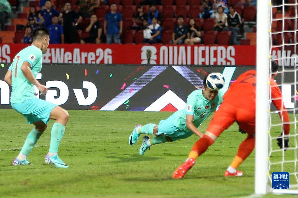 11月16日,中國隊球員王上源(中)在比賽中頭球攻門得分。當日,在泰國曼谷舉行的2026世界杯預選賽亞洲區(qū)36強賽C組比賽中,中國隊以2比1戰(zhàn)勝泰國隊。新華社記者 王騰 攝