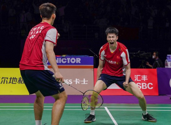 2023年5月20日,中國隊組合劉雨辰/歐烜屹(右)在2023年蘇迪曼杯世界羽毛球混合團(tuán)體錦標(biāo)賽半決賽男雙比賽后慶祝。新華社記者李博攝