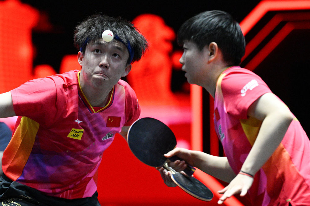 資料圖:孫穎莎/王楚欽(左)在比賽中。新華社發(fā)(鄧智煒攝)