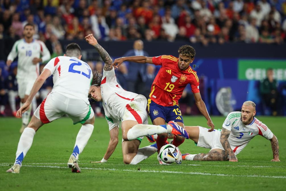 6月20日,西班牙隊球員亞馬爾(右二)在比賽中帶球突破。當(dāng)日,在德國蓋爾森基興進行的2024歐洲足球錦標(biāo)賽B組次輪比賽中,西班牙隊1比0戰(zhàn)勝意大利隊。新華社記者 潘昱龍 攝