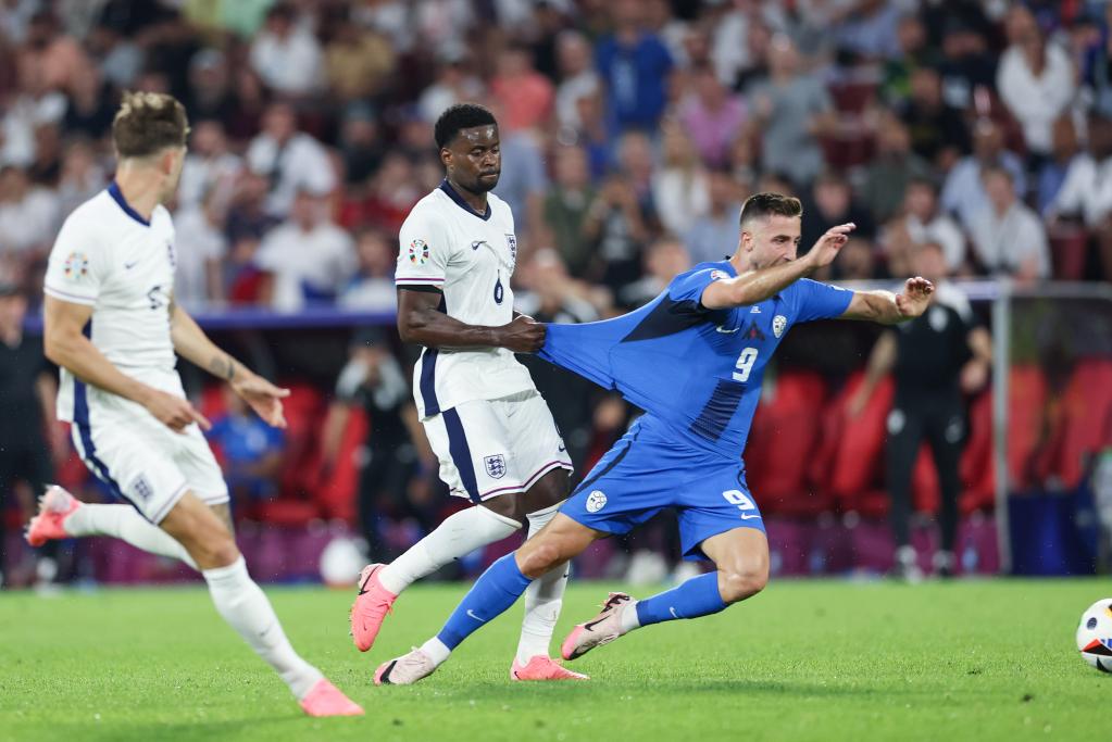 6月25日,英格蘭隊球員格希(中)在比賽中犯規(guī)。當(dāng)日,在德國科隆進行的2024歐洲足球錦標(biāo)賽C組第三輪比賽中,英格蘭隊0比0戰(zhàn)平斯洛文尼亞隊。新華社記者 白雪飛 攝