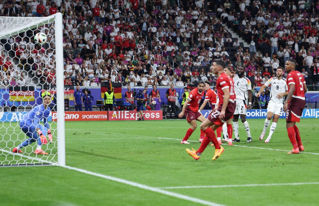 6月23日,德國隊球員菲爾克魯格(右二)破門得分。當(dāng)日,在德國法蘭克福進行的2024歐洲足球錦標(biāo)賽A組第三輪比賽中,德國隊1比1戰(zhàn)平瑞士隊。新華社記者 白雪飛 攝