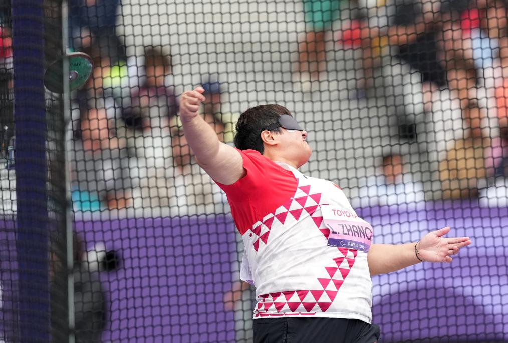 9月3日,張亮敏在比賽中試投。當日,在巴黎殘奧會田徑女子鐵餅F11級決賽中,中國選手張亮敏以39米08的成績獲得金牌。新華社記者 賀燦鈴 攝