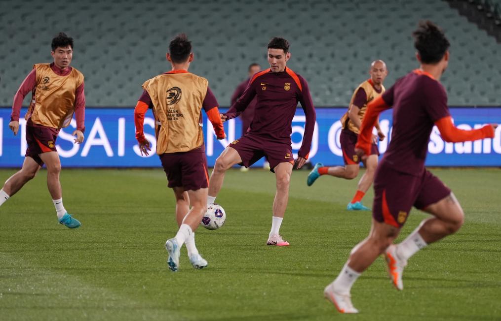 10月9日,中國隊球員拜合拉木(中)在訓練中。新華社發(fā)(謝思達 攝)