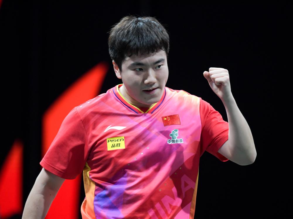 12月4日,中國隊選手梁靖崑在男單比賽中慶祝得分。新華社記者 王曦 攝