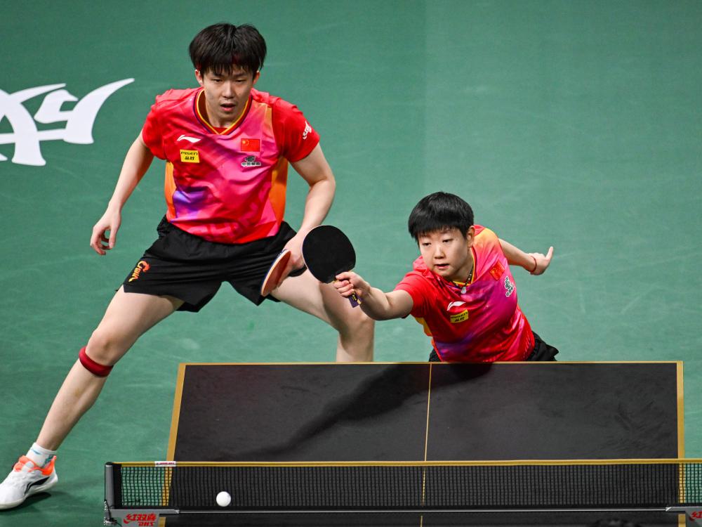 12月8日,中國隊(duì)組合王楚欽/孫穎莎(右)在混雙比賽中。新華社記者 王曦 攝