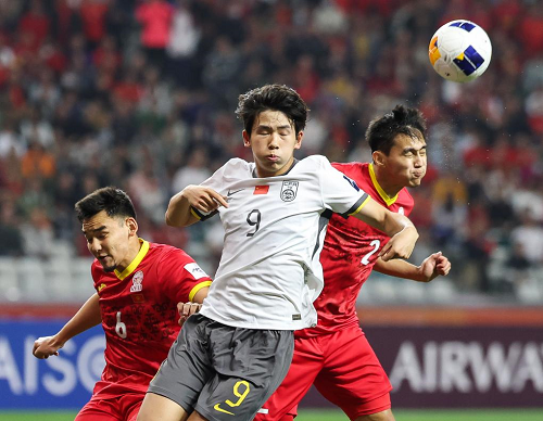 2月15日,中國(guó)隊(duì)球員劉誠(chéng)宇(中)在比賽中爭(zhēng)頂。當(dāng)日,在深圳舉行的2025亞足聯(lián)U20亞洲杯小組賽中,中國(guó)隊(duì)5:2戰(zhàn)勝吉爾吉斯斯坦隊(duì)。新華社記者 劉大偉 攝