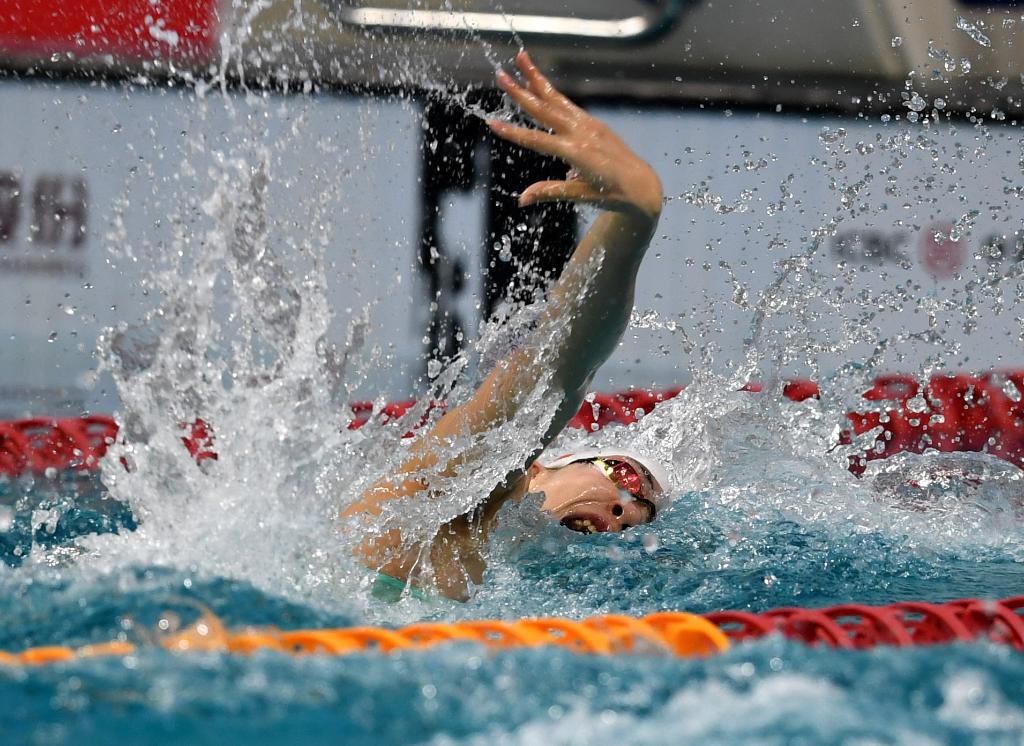 3月18日,江西隊(duì)選手程玉潔在女子100米自由泳決賽中,最終她以53秒91的成績(jī)獲得冠軍。新華社記者 李紫恒 攝